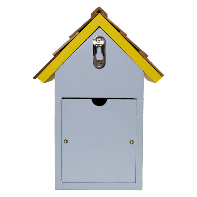 Transform your backyard bird garden into an elegant and floral locale for feathered friends with this charming Home Bazaar Sunflower Print Standard Bird Cottage. The pristine, delightful shelter sports a light blue color for lovely and delicate allure, while sunflowers along the front and side panels provide contrast and a splash of additional color. A charming bird rendering hovers above the sunflowers on the front of the home to create an entertaining portrait, while the 1.375" diameter entrance and pitched, wood shingled roof are bordered with vivid yellow to create an alluring embellishment in your bird garden. A metal keyhole bracket on the home's rear lets you easily mount the domicile against a post or wall, or employ a mounting bracket (not included) to showcase the home atop a pole or post for a different look. The 4.75" x 4.5", rectangular base of this colorful, floral abode features a pair of holes to encourage drainage of accumulated moisture, and gaps beneath the roof overhang help with ventilation to ensure a fresh roost for feathered inhabitants. A 4.25" x 3.75" rear panel may be unscrewed to gain easy access to the nesting chamber when nest checks and cleanings are needed, and a mesh ladder inside the shelter rests just below the entrance, offering fledglings an easy grip as they try to exit the dwelling. Staunch wooden construction lends durable and lasting quality to the piece, letting nearby birds enjoy this rustic and alluring nesting site as it graces your luxurious bird garden. Spotlight glorious sunflowers and beautiful, vibrant tones in your backyard space while harboring feathered friends with the Sunflower Print Standard Bird Cottage.