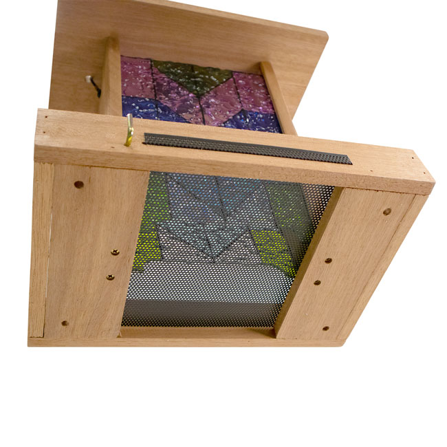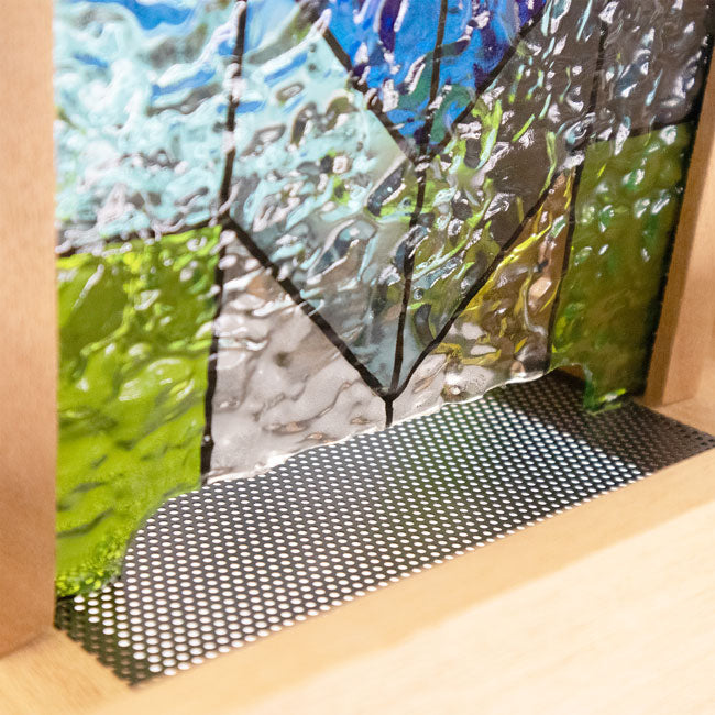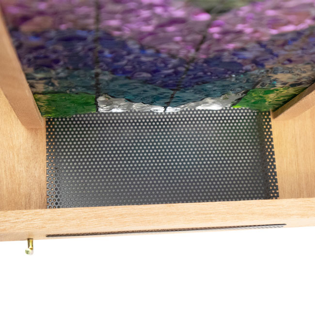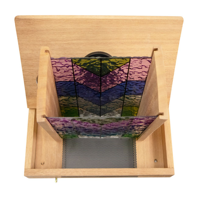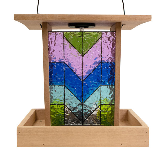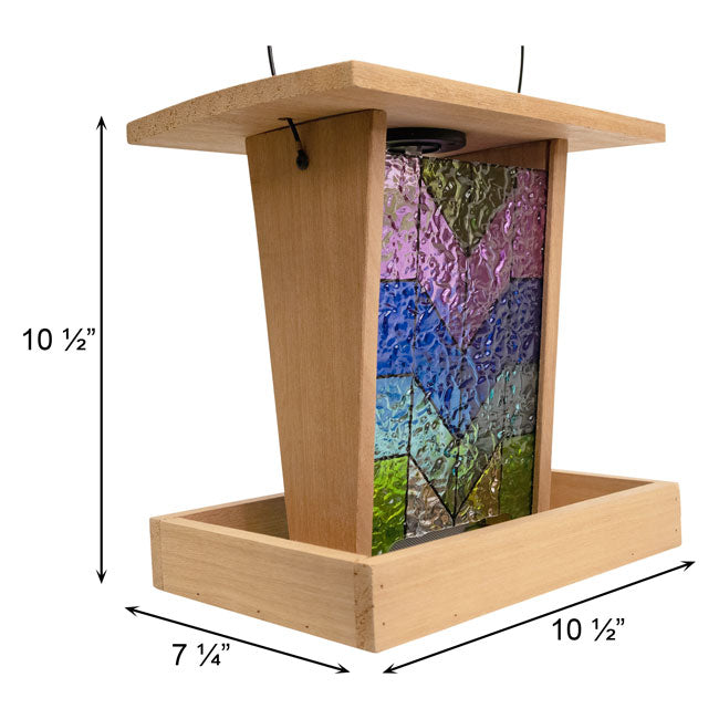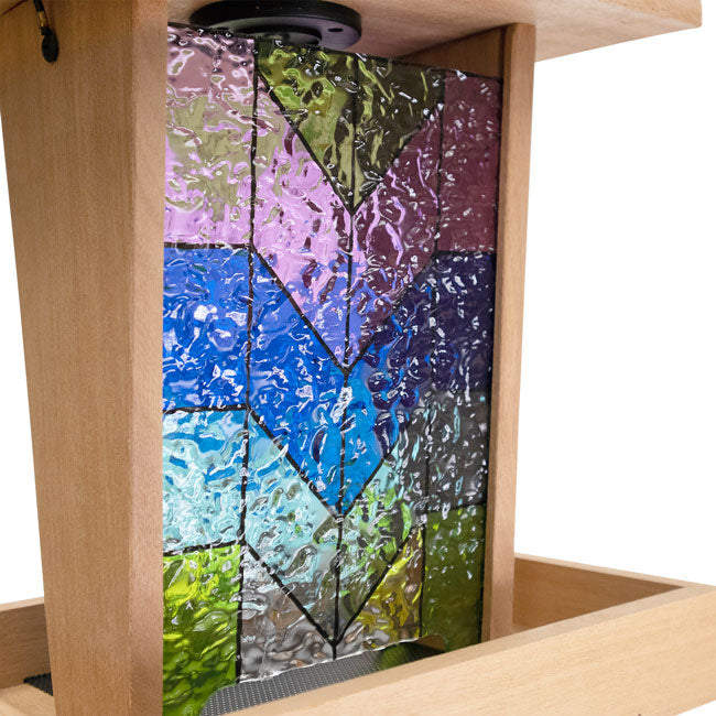 - Brilliant, stained glass panels provide color on both sides of the seed hopper, for maximum beauty