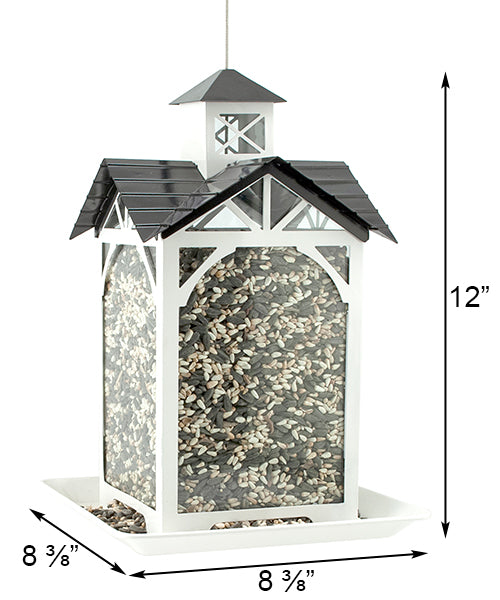 Feed your backyard birds with farmhouse style using this Woodlink Modern Farmhouse Metal & Glass Stable Bird Feeder. The framed truss designs and gabled roof of this feeder mimic a stable, bringing a farm aesthetic to your bird garden, while its simple black and white color scheme adds a timeless air. Its clear, glass reservoir holds up to 2 quarts of seed, which fills the tray through four 0.5" gaps underneath, while offering visibility of seed levels from a distance. Small holes around the tray offer drainage for keeping the seed dry, and a 1" angled lip encloses it and enables perching for small birds. Raised lines throughout the lid resemble corrugated metal roofing, and this section is removable for simple filling and cleaning, and is also attached to a black cord atop the stable's cupola for easy hanging on a branch or hook. The glass and metal construction creates a durable store for seed while accenting any garden space. Bring your local birds in to stable using this Modern Farmhouse Metal & Glass Stable Bird Feeder.