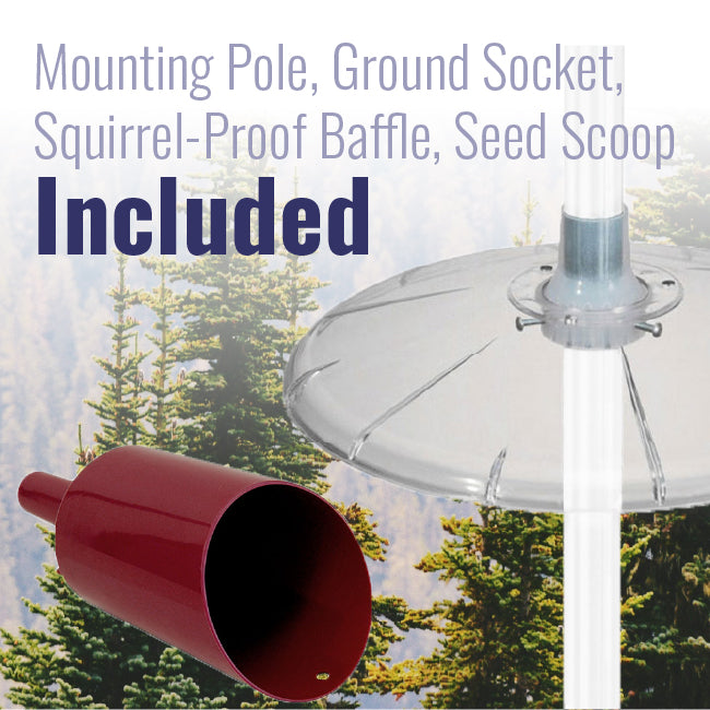 Feed an entire flock of birds in your backyard using this Heath Le Grande Gazebo Bird Feeder Combo. This package makes it easy to display a feeder in your yard, while discouraging squirrels from dining. The hexagonal, cedar frame and plastic panels create the generous hopper feeder, which holds an astonishing 11.5 quarts of seed to keep birds well-fed for some time. The clear panels ensure feed levels and all your backyard birds remain visible, and gaps on the base of each allow them to reach their treat. The included seed scoop makes it simple to fill the piece while remaining tidy, and the roof fully removes to accommodate this. Place this significant reservoir on the included, telescoping metal pole for a fantastic and versatile display. An included, plastic ground socket installs into soil to support this pole, and a plastic mounting bracket holds the Gazebo Bird Feeder in place atop it. Key locks keep the three metal pole sections at the right extension, and each can be twisted and removed for raising and lowering the feeder as desired. A 13.375" diameter, plastic baffle also slides onto this pole, shielding the Gazebo Bird Feeder from squirrels, and a finial threads onto the feeder roof to prevent animals from lifting it and pilfering seed. Crafted from rot-resistant cedar, hardy plastic, and robust metal, this Gazebo Bird Feeder brings a classic look to your garden for many seasons, and the brown tones on the frame accent your existing flora. The large size and six sides of the feeder allow several birds to dine with ease, and the included pole enables you to place it in an open spot in your landscaping. Supply birds a lasting food source by adding this Le Grande Gazebo Bird Feeder Combo to your yard. Assembly required. Made in the USA.