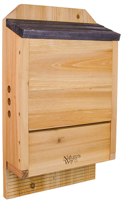 Provide housing to fantastic pollinators by placing this Nature’s Way Cedar Three Chamber Bat House - 300 bats in your yard. Crafted from lasting cedar and loaded with unique features, this triple chamber bat house is a perfect addition to any garden sanctuary. Bats will often naturally divide into bachelor and nursery colonies, and this classic piece provides them plenty of space to do so. Routed, horizontal lines on the extended landing pad help bats safely grip the piece, and this platform leads to the three cells, each with netting on one side for additional bat resting areas. The lapped, black roof covers the unit and helps absorb heat, while a 0.25" wide ventilation gap near the base aids in regulating the internal temperature. The interior, dividing panels can be removed at the end of each season for maintenance and thorough cleaning, for a lasting piece. The tan tone of the bat house will age to a lovely gray hue over time, and its all cedar body repels rot and insects naturally. Place an adapter (not included) on the flat back of this bat house to pole mount it, or affix it to a wall or post using screws. Welcome bats into your yard by adding this Cedar Three Chamber Bat House to it. Three year manufacturer's warranty.